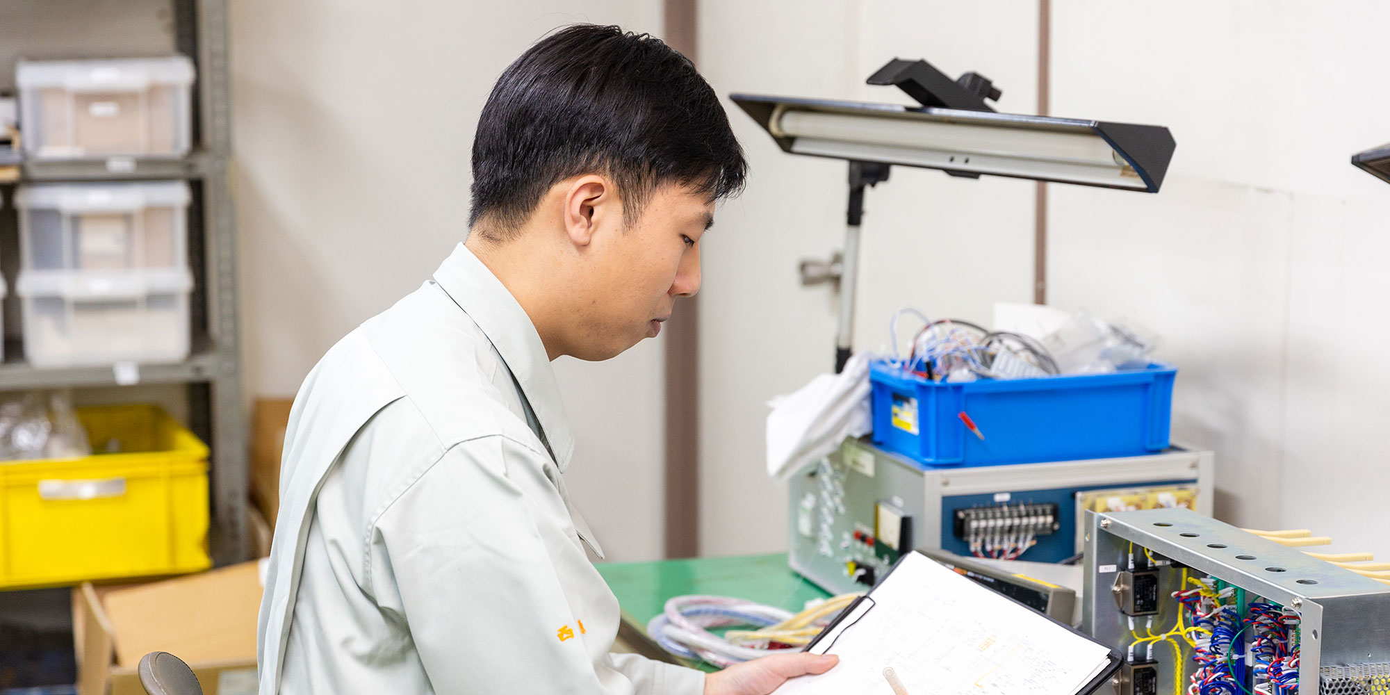 配属されたHF電気技術課では主力製品であるトランジスタ式高周波発振機の設計、調整、納入サポート、アフターサービスを行っています。お客様が求める熱処理に合わせて発振機や整合盤を設計する仕事は簡単ではありませんが、自分が関わった仕事が形となり、新たな製品造りに貢献できることは大きな喜びになっています。